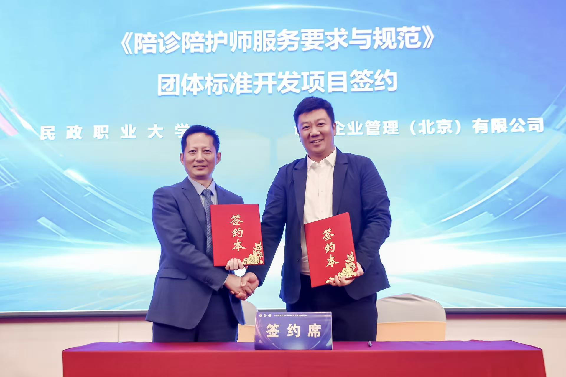 会上,诚通人力旗下康养板块诚通企业管理(北京)有限公司(简称“诚通企管”)作为签约主体与民政职业大学签署了《陪诊陪护师服务要求与规范》团体标准开发项目合作协议。未来诚通企管将和民政职业大学共同推进养老服务人才的标准化建设及产教融合实训基地建设,共同推动养老行业的标准化、专业化发展。